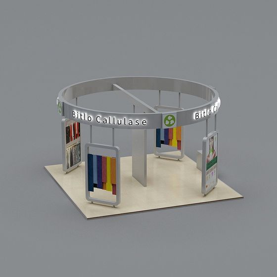 The Bitlo Callulase Trade Booth 3D model offers a sleek round metal frame with a soft white base and vibrant LED-lit posters. Built with low-polygon, high-detail geometry for smooth performance in interior design, gaming, and VR projects.