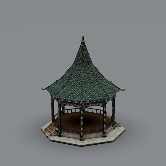 The Classic Pavilion 3D model features a deep green tiled roof with detailed wooden textures and sturdy stone foundations. Built with low polygon count for efficient rendering, it suits indoor courtyards, gaming, and VR visualization projects.