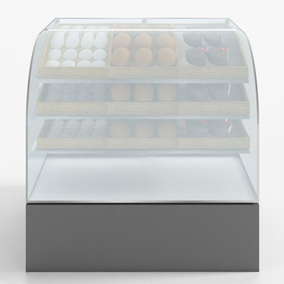 The bakery display case features a modern wooden frame with transparent glass top showcasing breads and pastries. Built with 1,500 optimized polygons, it suits cafe interiors, kitchen designs, and game environments.