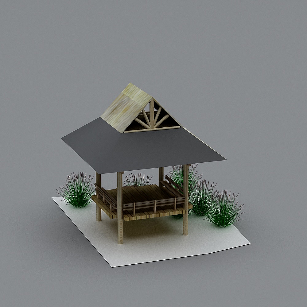 The Zen Bamboo Pavilion 3D model features a light brown wooden frame with a deep gray tiled roof. Built with low-poly geometry and detailed textures, it suits architectural visualization, VR, gaming, and animation projects blending traditional style and natural ambiance.
