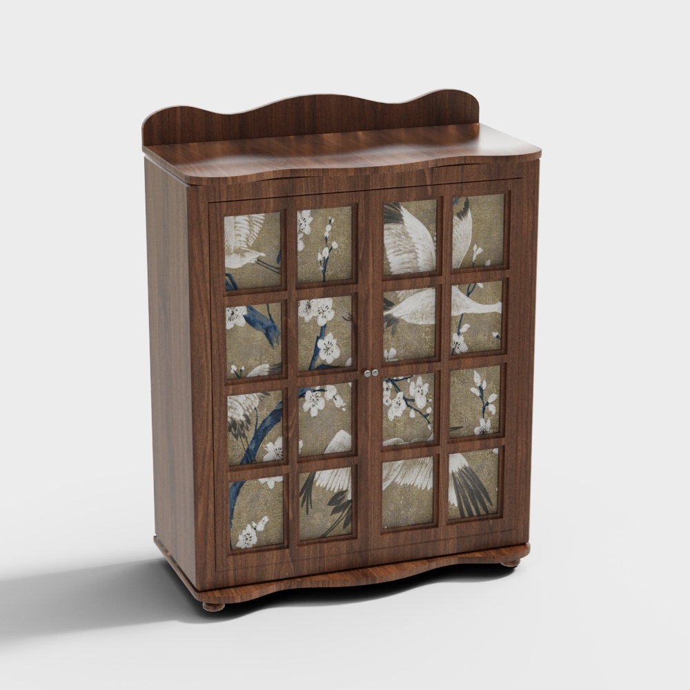 The Japanese Aesthetic Antique Cabinet 3D model features rich brown wood with intricate bird and flower patterns. With 3,500 optimized polygons and detailed textures, it suits interior design, immersive gaming, and cultural visualizations.