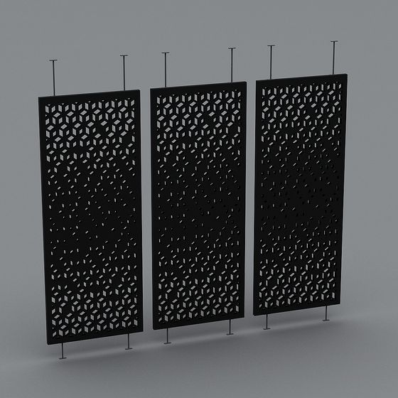 The Elegant Geometric Black Room Divider 3D model features deep black material with intricate white cut-out patterns. Built with around 500 polygons, it combines low-poly simplicity and high detail, ideal for interior design, VR, and gaming projects.
