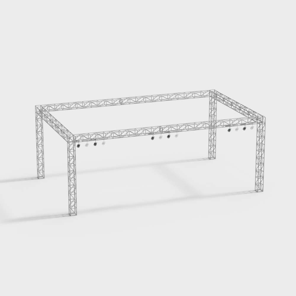 The Stage Lighting Rig features a black metal frame with deep blue shades, crafted with 1,200 optimized polygons. Ideal for stage setups, gaming scenes, and immersive VR environments requiring realistic lighting effects.