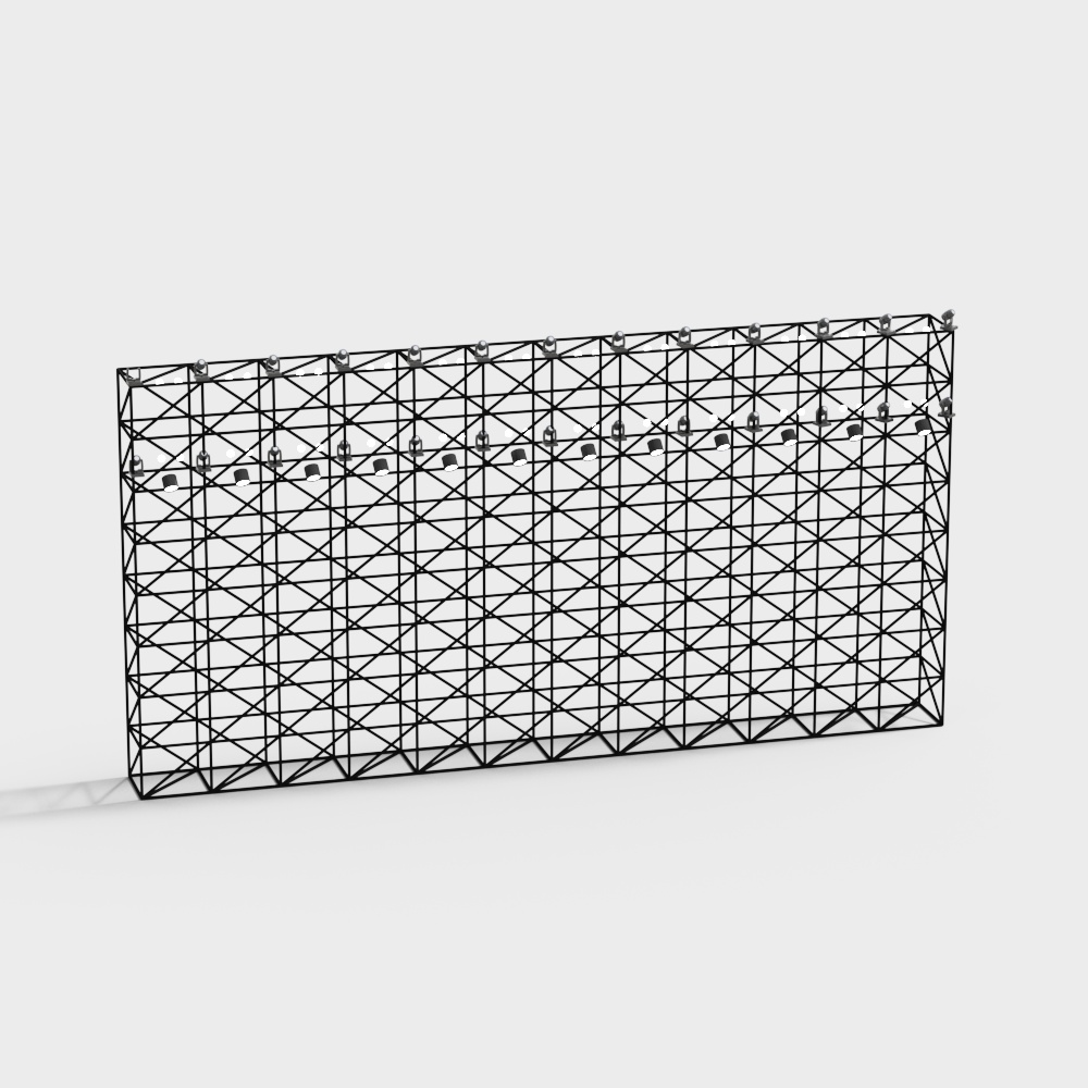 The Futuristic Grid Screen 3D model features a black metal low-poly frame with star-like interwoven lines. Built with 1,000 optimized polygons, it suits interior dividers, VR, gaming, and urban visualization projects.