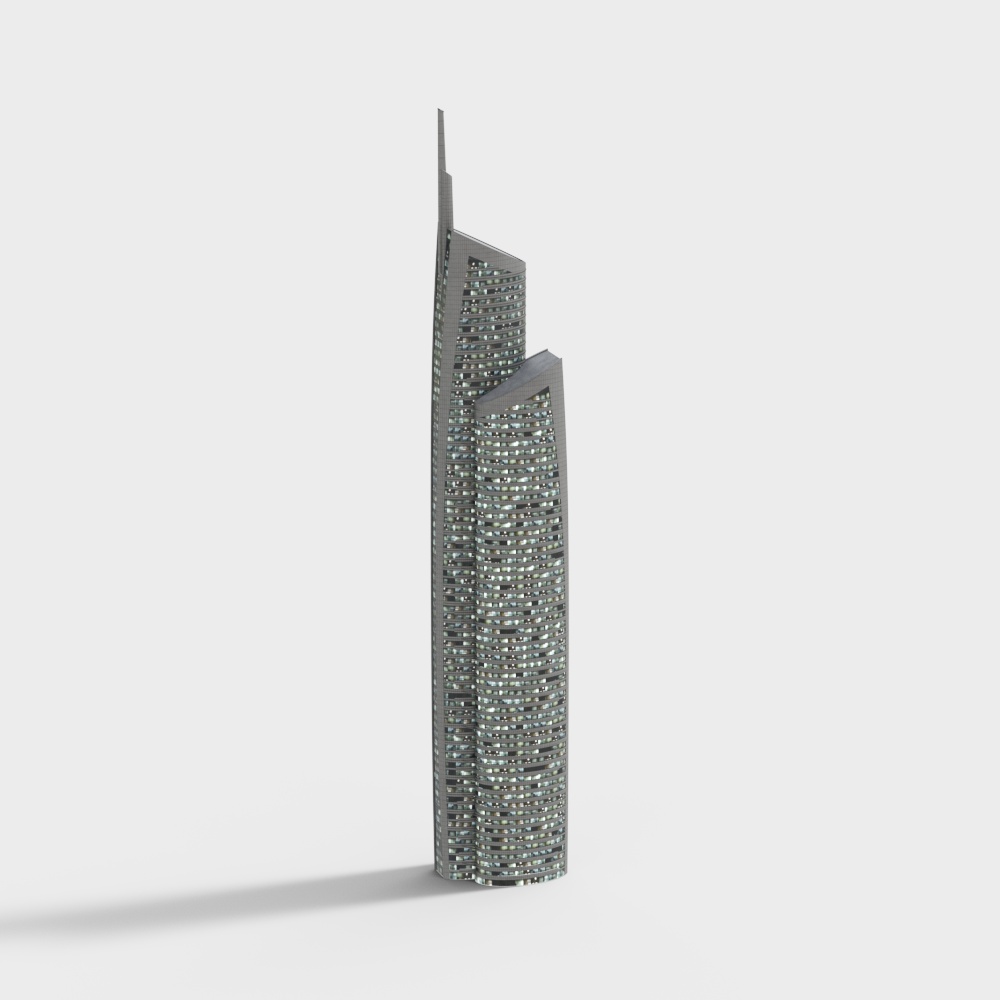 The Urban Skyscraper 3D model features a sleek gray concrete facade with dark glass windows. Built with 5,000 optimized polygons, it suits architectural visualization, game development, and VR urban scenes.