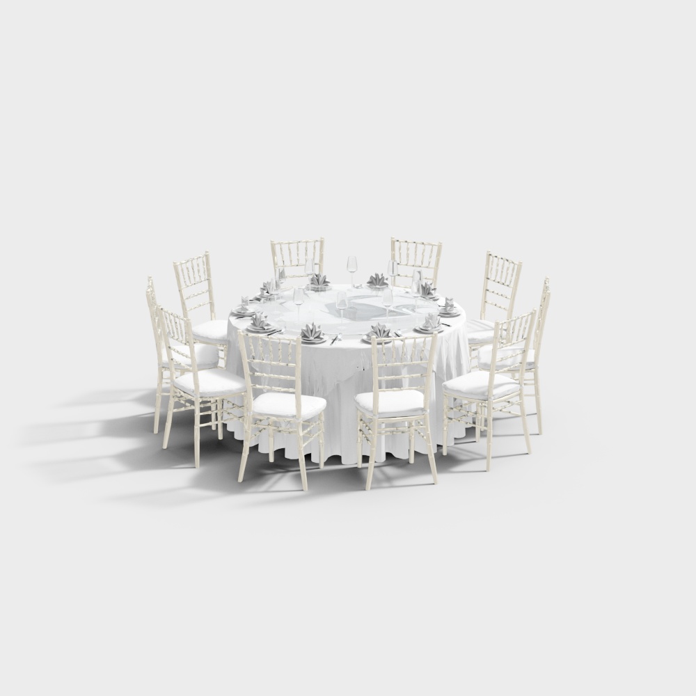 The Elegant Round Dining Table 3D model features white textured surfaces with a low-poly design of 1200 polygons. Surrounded by eight classic-style chairs, it suits interior design, VR, and game environments with a refined, minimalist aesthetic.