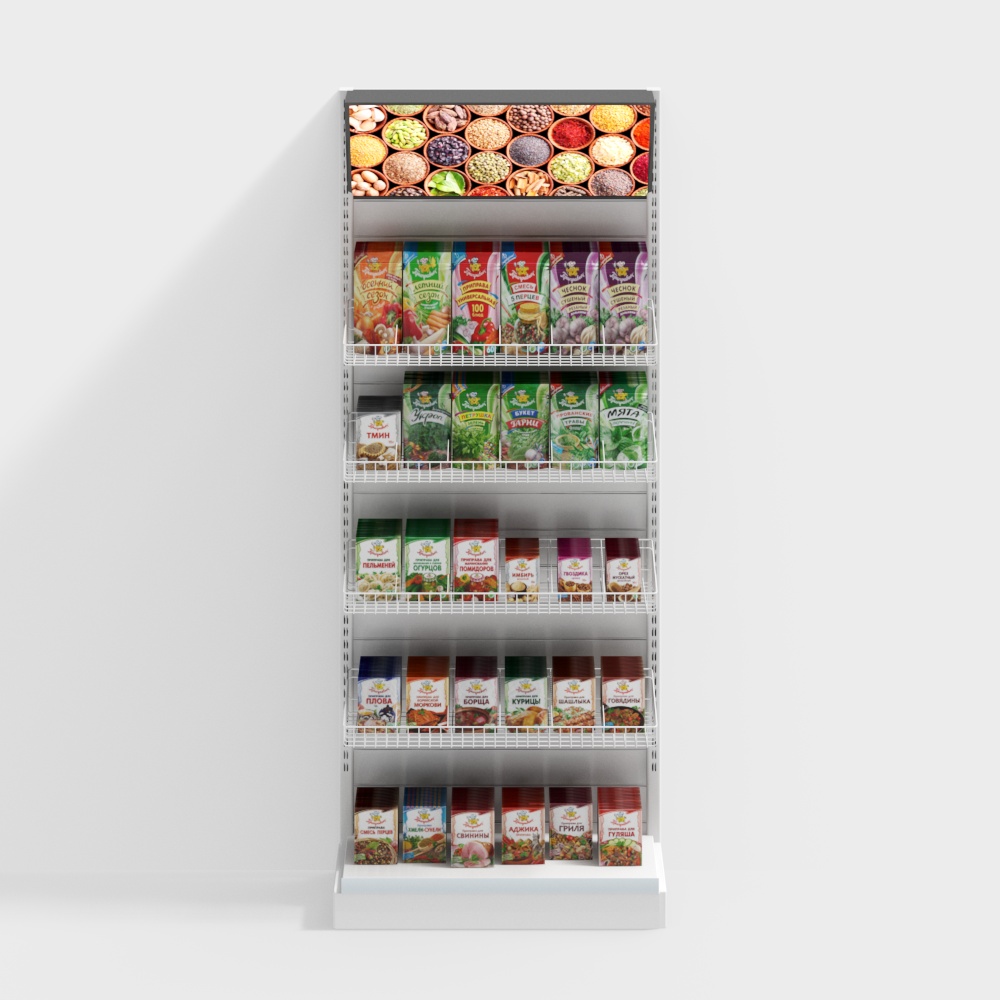 The Stylish Spice Rack 3D model features a gray metal frame with a white base, holding vibrant spices and canned goods. Built with 500 optimized polygons, it fits seamlessly into modern kitchens, gaming scenes, and VR culinary tutorials.