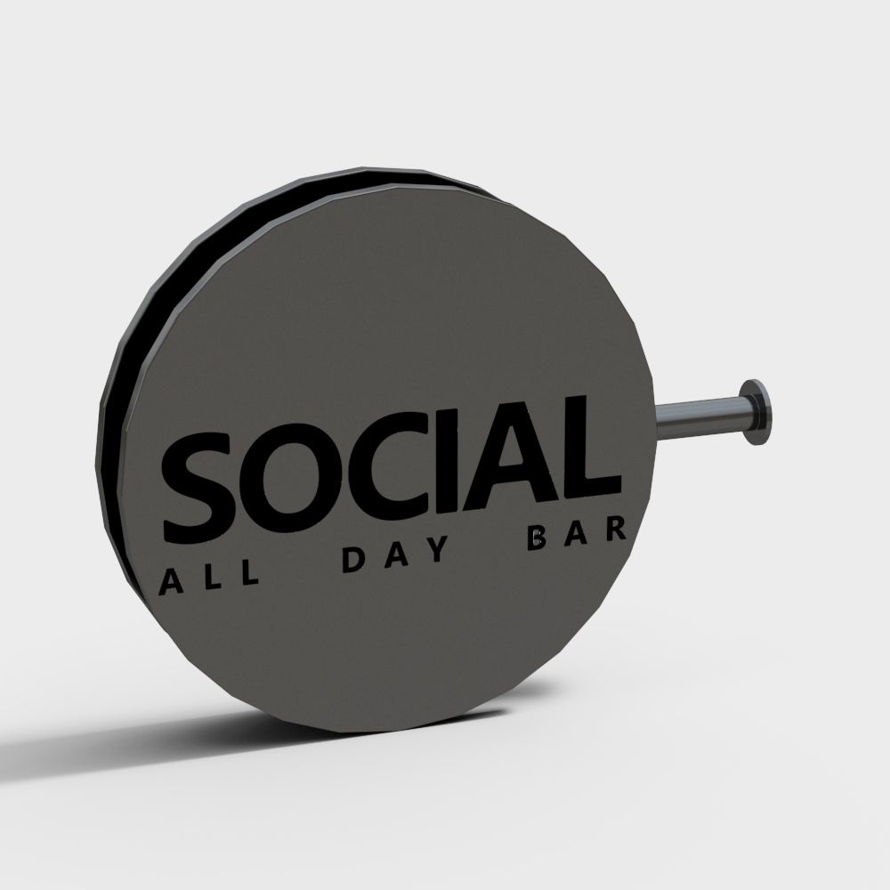 The Social All Day Bar 3D model showcases a deep gray metallic finish with bold lettering. Built with 1,000 polygons for optimized performance, it suits modern interiors, VR experiences, and game environments.