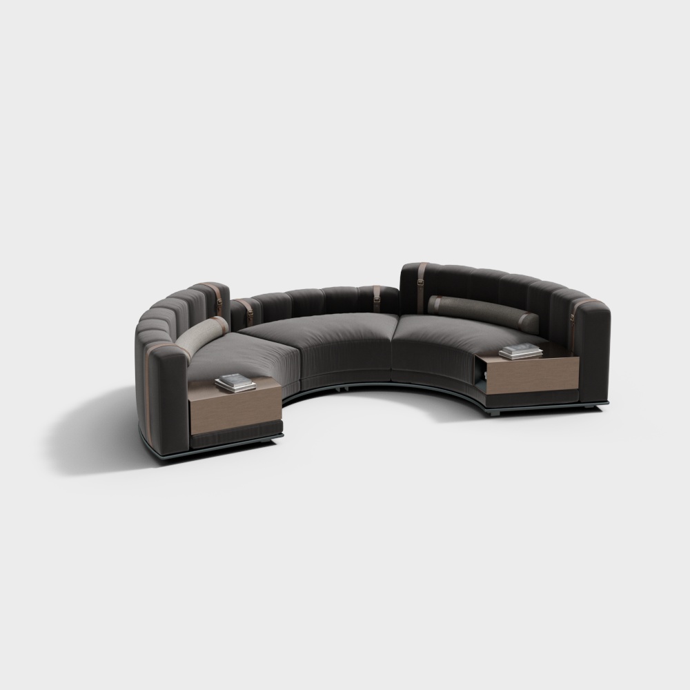 The Curve Comfort 3D sofa model showcases a sleek curved form in deep gray leather and light brown wood. Featuring 500 optimized polygons, it fits VR, games, and interior visualizations with high-quality textures and refined detail.