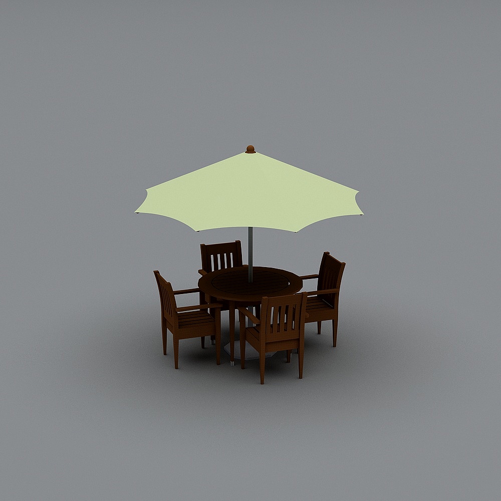 The Elegant Outdoor Dining Table and Chairs 3D model showcases deep brown wooden furniture with a clear texture and a green umbrella. Featuring 1,200 optimized polygons, it suits outdoor scenes, virtual environments, and interior design presentations.