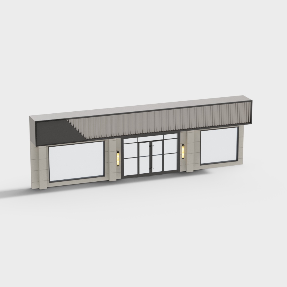 The Urban Facade 3D model showcases a modern gray exterior with sleek glass windows. Featuring 5,000 optimized polygons, it balances high detail and performance, ideal for architectural visualization, game development, and VR scenes.