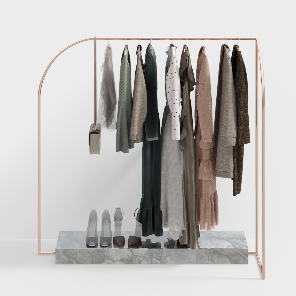 The Elegant Wardrobe Rack 3D model features a rose gold frame paired with a natural marble base. With 1,200 optimized polygons, it balances modern luxury and low-poly efficiency for interior design, gaming, and visualization projects.
