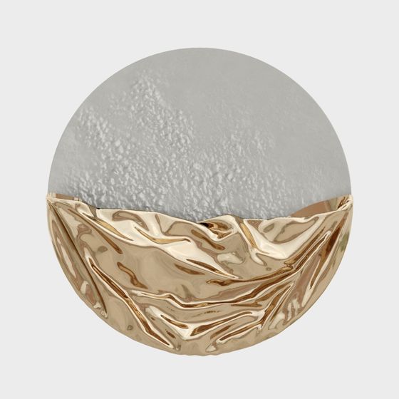 The Luminous Hemisphere 3D model showcases a matte silver-gray dome with flowing golden wave details at the base. Featuring 1,200 optimized polygons, it suits VR, animations, and interior design projects with vibrant contrast and depth.