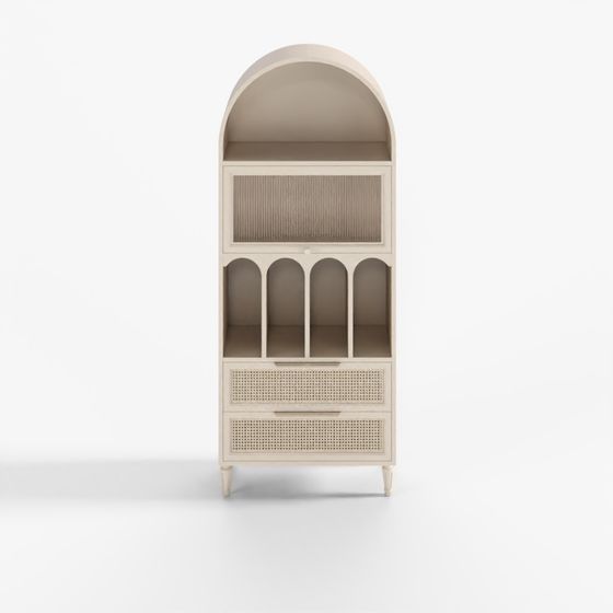The Elegant Vintage Bookshelf 3D model showcases a wood-textured design in beige and light gray with an arched top and grid-patterned doors. Featuring low-poly geometry optimized for interior design, gaming, and VR applications.