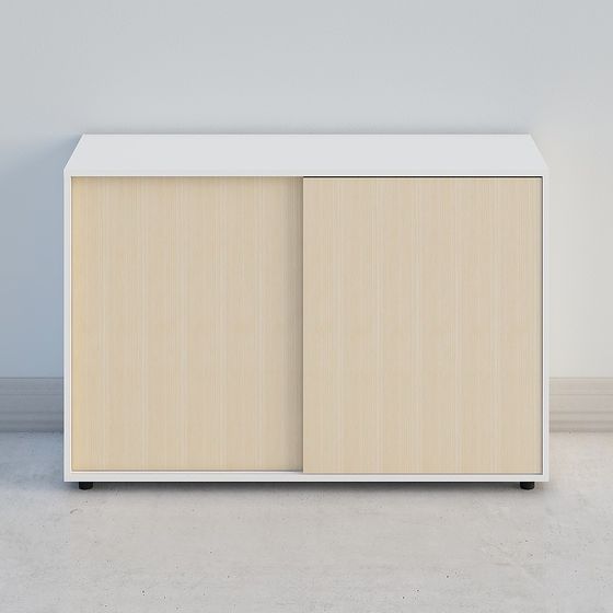 The Sleek Sliding Door Storage Cabinet 3D model features light wood grain panels with a sleek white frame. Built with 1,200 polygons, it balances detail and performance for interior design, game development, and VR projects.