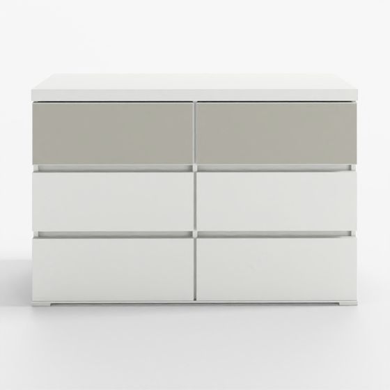The Elegant Six-Drawer Storage Cabinet 3D model showcases a white finish with wood grain textures and gold handles. Built with around 1,000 polygons, it fits perfectly into interior design, gaming, and visualization projects.
