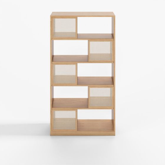 The Modern Low-Poly Bookshelf 3D model features a wooden frame with delicate woven textures. Built with low-poly geometry for optimized performance, it suits interior design, game development, and VR environments.