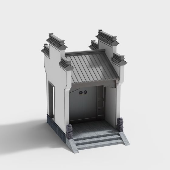 The Traditional Chinese Archway 3D model features a gray tiled roof, white walls, and black stone steps with door rings. Built with 1,000 polygons, it blends classical details and realistic textures, ideal for historical gaming, architectural visualization, and interior designs.