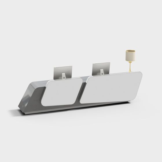The Futuristic Reception Desk 3D model presents a gray metallic frame with white panels, highlighted by embedded displays and a golden lamp. Featuring 1,200 optimized polygons, it suits interior design, gaming, and VR applications.