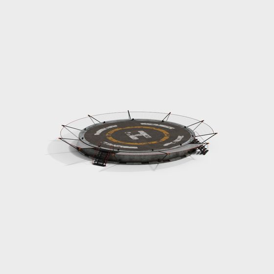 The Helipad Landing Zone 3D model features a yellow circular sign with black runway markings and red safety net on textured gray steps. Built with 500 polygons, it suits VR, gaming, and architectural visualization.