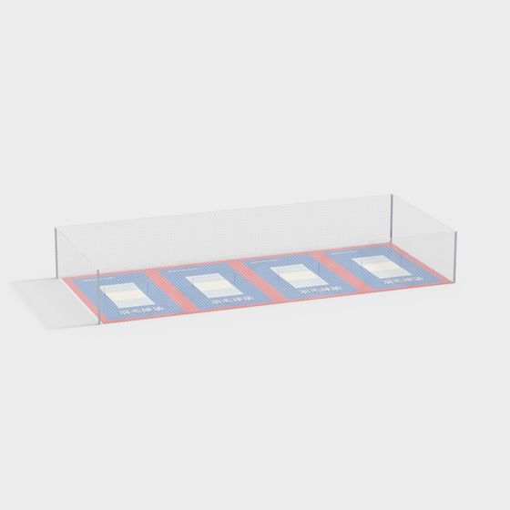 The Modern Badminton Court 3D model features vibrant blue and red plastic flooring with a metallic net. Built with a moderate polygon count, it delivers smooth performance, ideal for indoor designs, games, and sports visualizations.