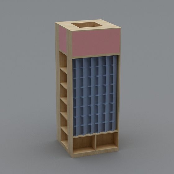 The Modular Display Rack features soft wood tones with pink accents and deep blue compartments. Built with low-poly geometry for efficient rendering, it suits interior decor, gaming scenes, and VR projects.