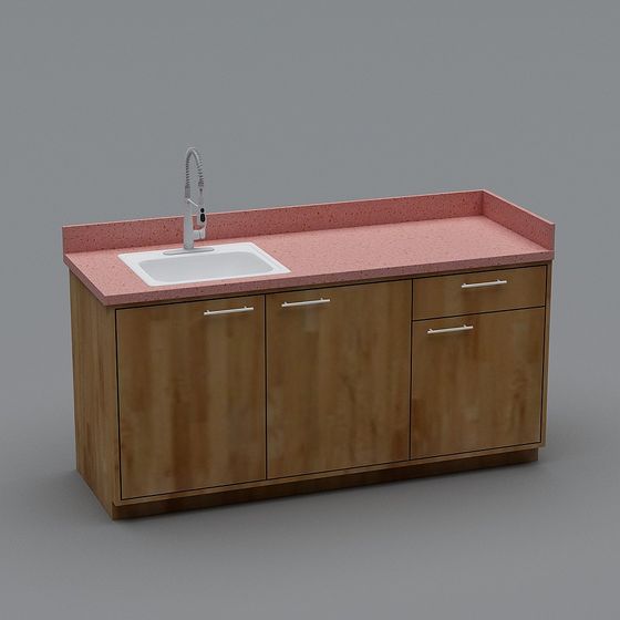 The Stylish Low-Poly Kitchen Sink Cabinet 3D model features a light brown wood texture paired with a pink marble countertop and sleek faucet. Low-poly with 1,200 polygons, it’s ideal for gaming, VR, and modern interior visualizations.