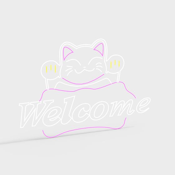 The Lovely Lucky Cat Welcome Sign 3D model features a low-poly design in warm pink and white tones. Crafted for quick rendering with optimized polygons, it suits interior decoration, games, and VR environments inspired by Japanese culture.