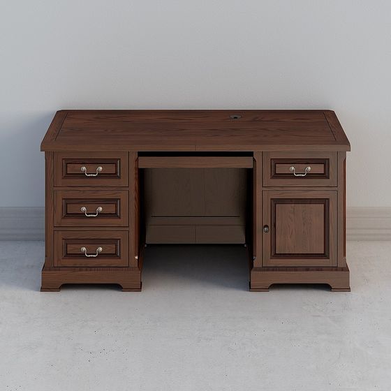 Designed with a deep brown wood finish and silver handles, this Classic Wooden Office Desk 3D model features low-poly geometry with detailed texture for smooth, realistic wood grain. Ideal for interior designs, VR scenes, and game environments.