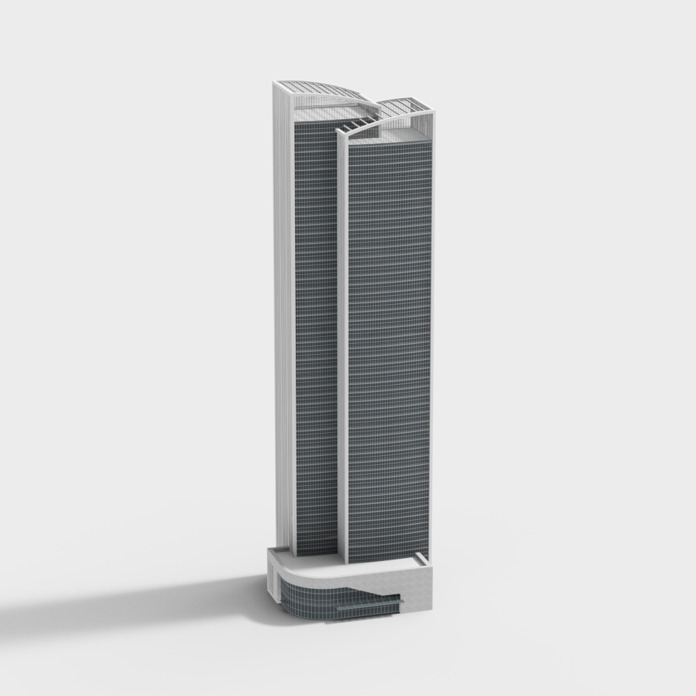 The Stunning Skyscraper 3D model presents a gray exterior with dark glass in a distinctive geometric shape. Built with around 1,000 polygons, it balances minimalist style and modern architecture for urban scenes, VR, and game development.