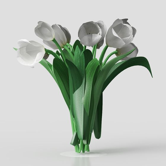The Low Poly Tulip Bouquet 3D model showcases snow-white tulips with detailed petals and deep green leaves. Featuring 1,200 optimized polygons, it suits VR, gaming, interior décor, and animation projects with vibrant spring aesthetics.
