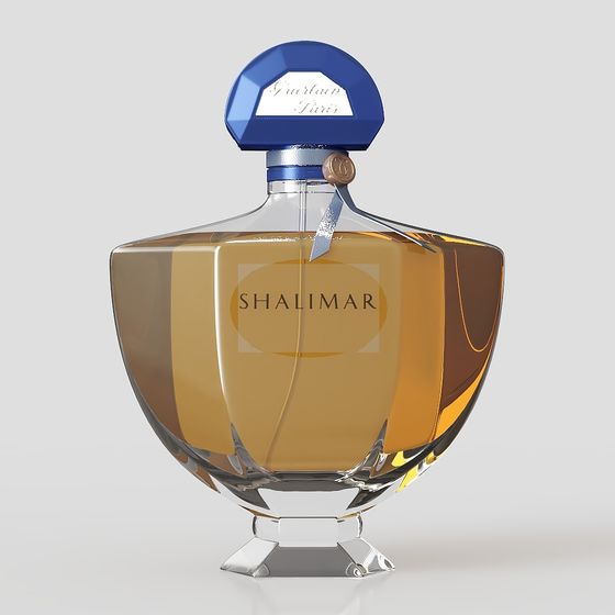 The Elegant Shalimar Perfume Bottle 3D model features transparent glass with golden liquid and a blue cap. With 500 polygons optimized for smooth rendering, it's suitable for VR, interior design, and game projects.