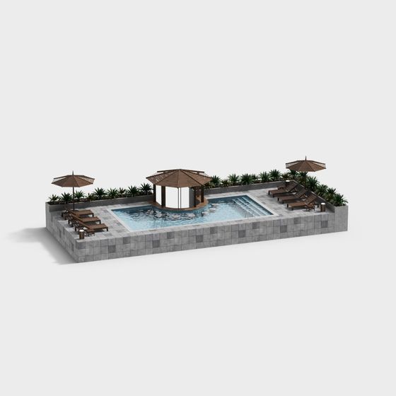 The Serene Rooftop Pool 3D model features realistic water textures, wooden lounge chairs, and lush greenery. With 2,500 optimized polygons, it suits architectural visualization, gaming, and VR projects requiring tranquil outdoor spaces.