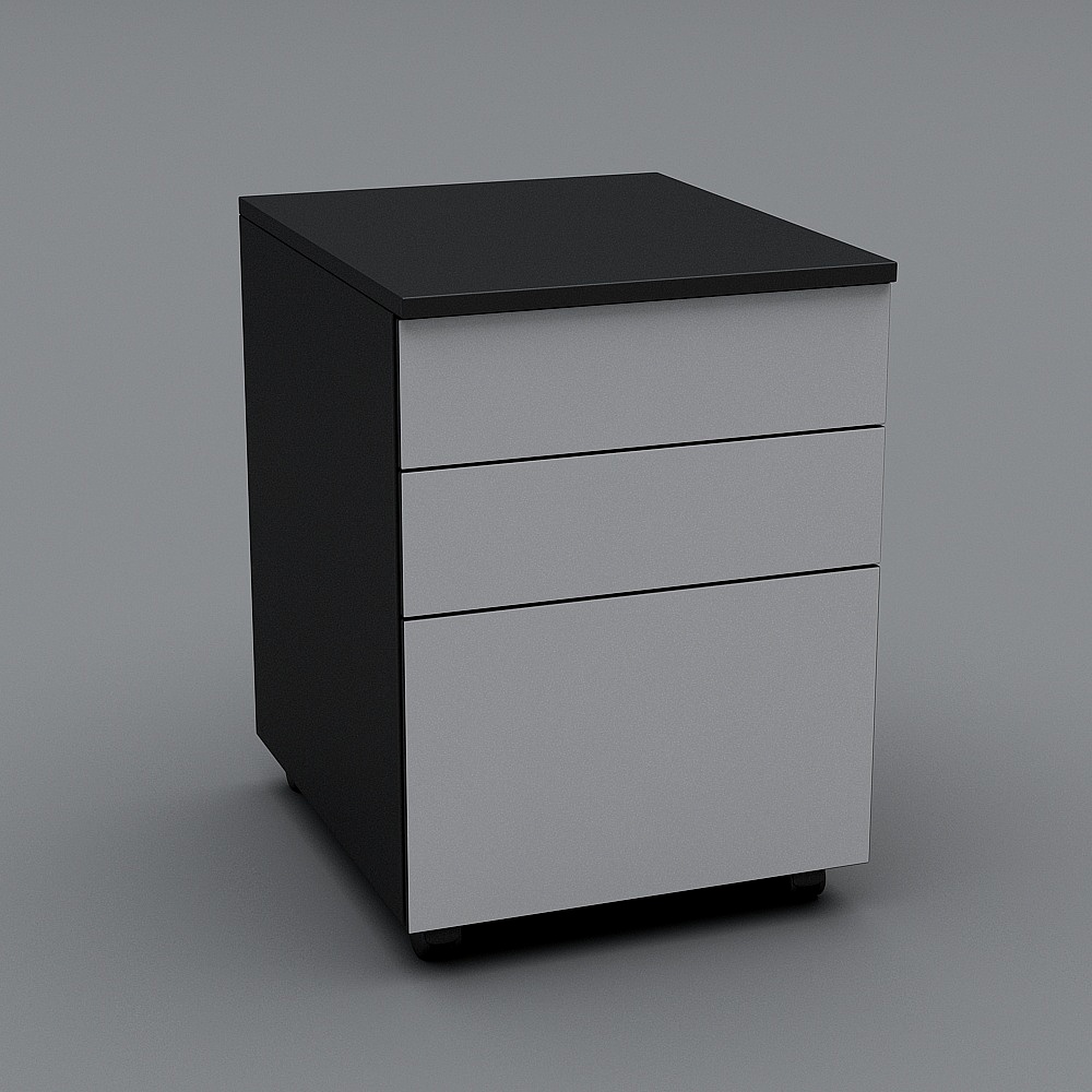 The Modern Minimalist Bedside Table 3D model showcases a black frame with silver-gray drawers and a smooth metallic finish. Featuring around 500 polygons for efficient rendering, it suits interior design, VR, gaming, and animation projects.