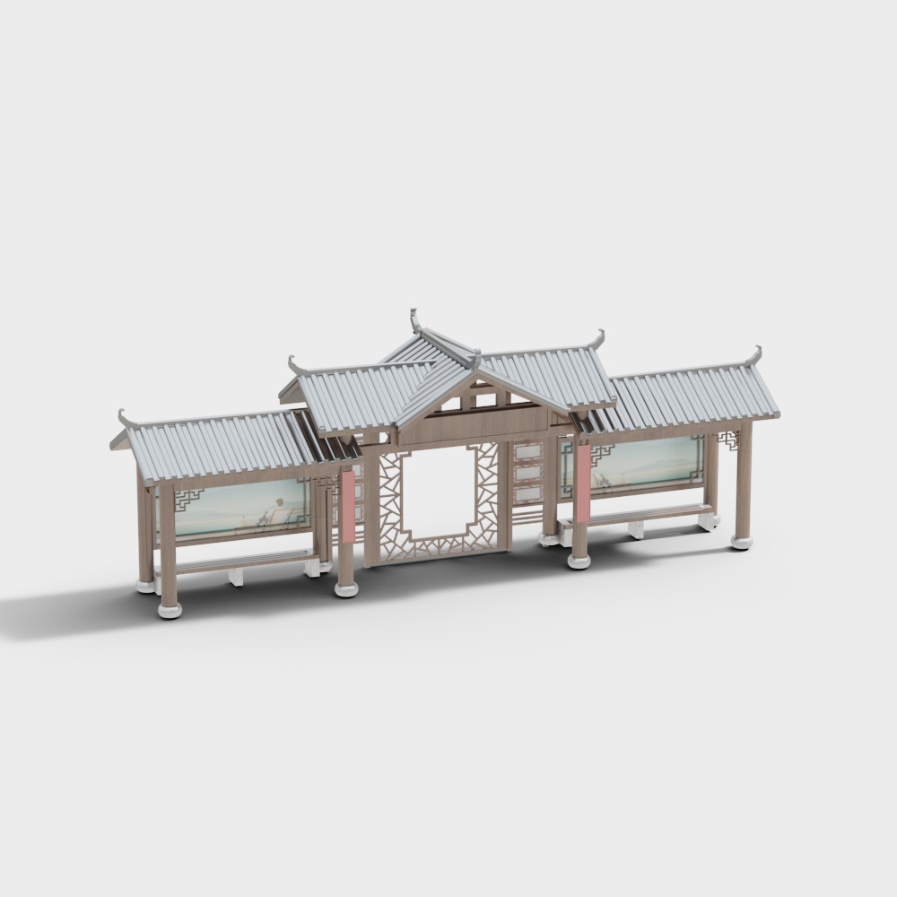 The Ancient Aesthetic Pavilion 3D model showcases soft beige and light gray tones with intricate openwork patterns and unique roof curves. Featuring 500 polygons and detailed textures, it suits serene interior designs, games, and virtual environments.