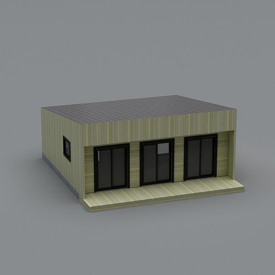The Modern Prefab House 3D model showcases a light wood facade and dark gray roof with black window frames. Built with 500 polygons, it balances minimalism and practicality for interior design, games, and visualization.