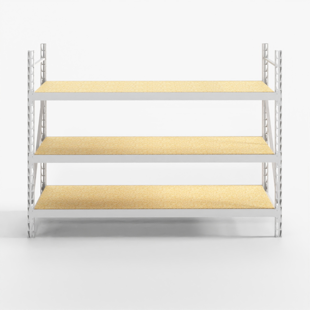 The Stylish Warehouse Shelving 3D model combines blue metal frames and textured wooden shelves with 3,500 polygons optimized for fast rendering. Ideal for industrial interiors, game environments, and VR logistics simulations.