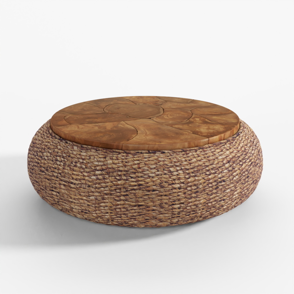 The Round Woven Cushion 3D model showcases a grey woven texture with a low-poly design. Built with 1,000 polygons for efficient rendering, it suits interior design, gaming, and VR settings.