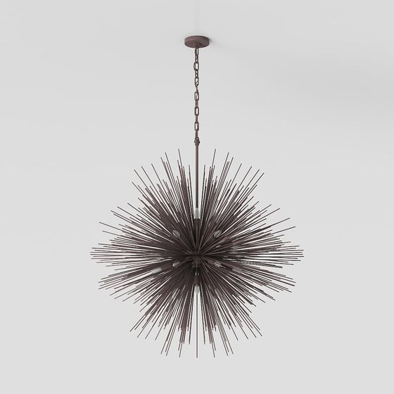 The Spike Sphere Pendant Light 3D model showcases a deep gray oxidized metal sphere with radiating metallic spikes. Built with low-poly geometry and polished edges, it suits interior design, VR, animation, and architectural projects.