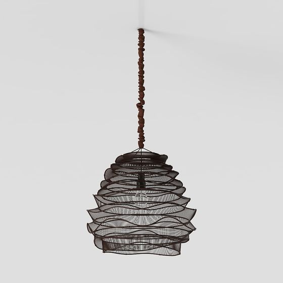 The Wave-Weave Pendant Lamp 3D model showcases a deep brown metal design inspired by ocean waves. With 500 polygons optimized for smooth rendering, it suits interior design, game development, and VR environments.