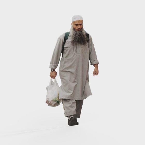 The Urban Walker 3D model presents a low-poly figure dressed in a traditional robe with a green backpack and vegetable bag. Featuring soft gray and vibrant green tones, it suits interior design, game development, and VR projects.