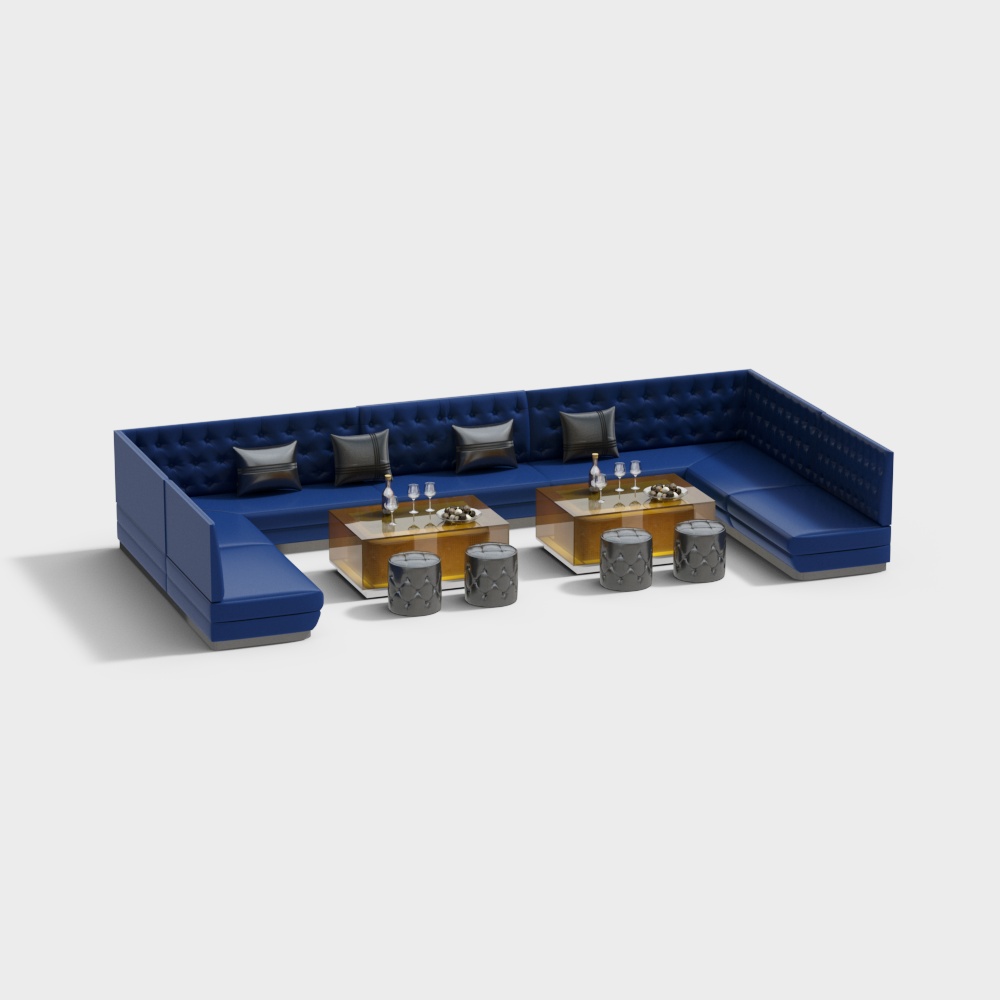 The Urban Lounge 3D model features a deep navy leather sofa with gray cushions and a gold glass coffee table. With 2,300 optimized polygons, it suits interior design, VR, and game projects with detailed textures and stylish materials.