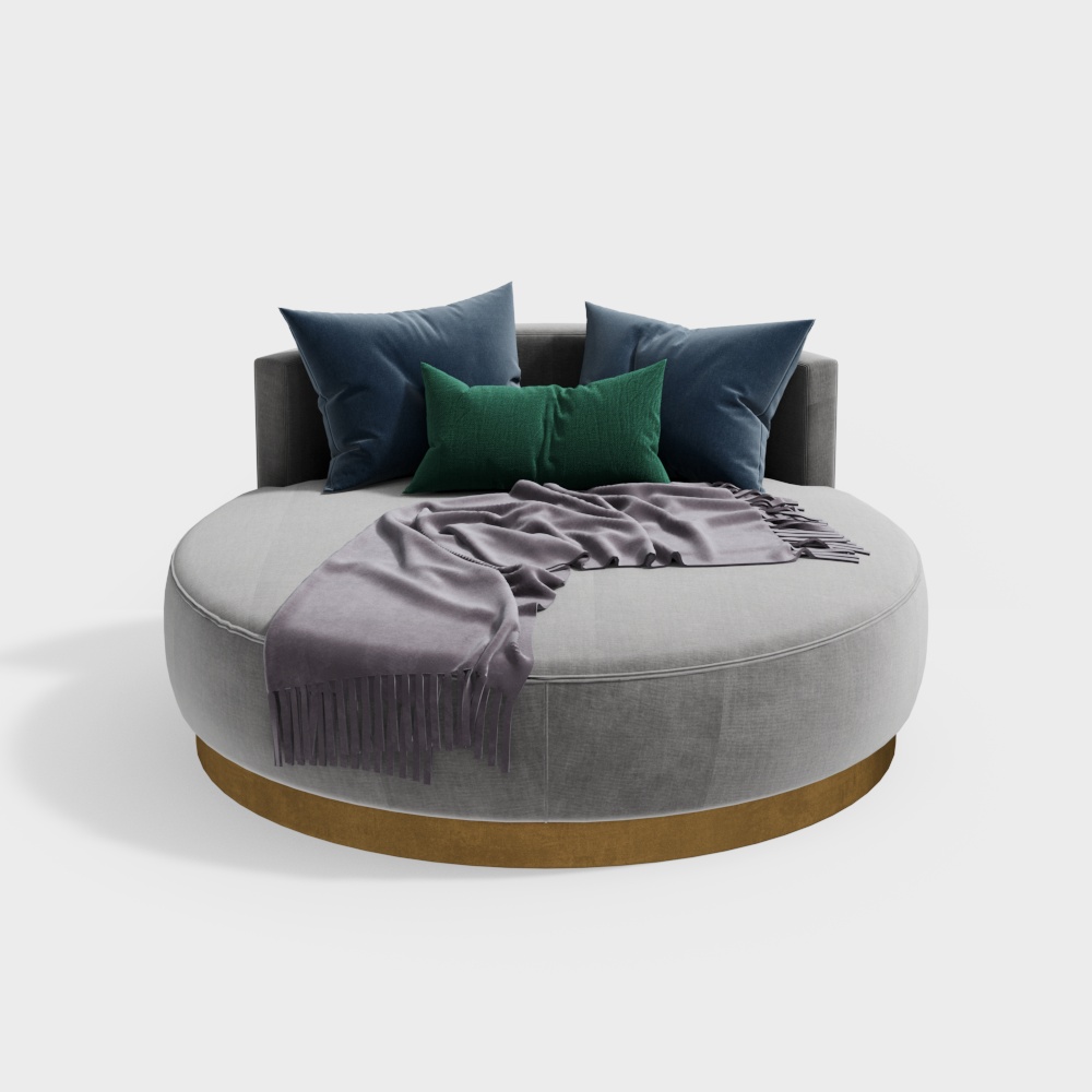 Designed for modern interiors, this round sofa bed features soft gray upholstery with vibrant blue and green cushions. With 1,200 optimized polygons, it offers smooth rendering for interior design, architectural visualization, and gaming projects.