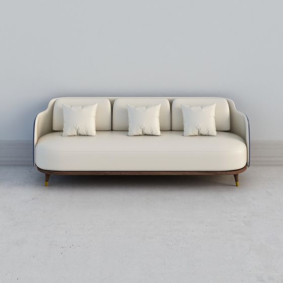 The Urban Comfort 3D model sofa showcases a modern minimalist design with soft beige leather and deep blue cushions. Featuring a wooden base with gold nail accents, it includes 1,200 optimized polygons for smooth rendering in interior design, gaming, and VR projects.