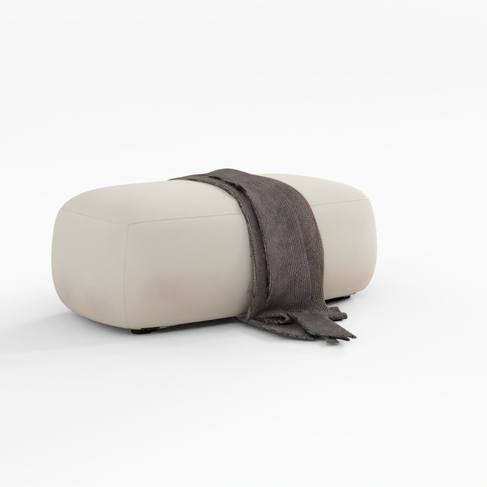 The Urban Comfort Ottoman 3D model features beige leather upholstery and a deep gray metal base with a gray striped blanket. Built with 500 optimized polygons, it suits interior design, game development, and animation projects.