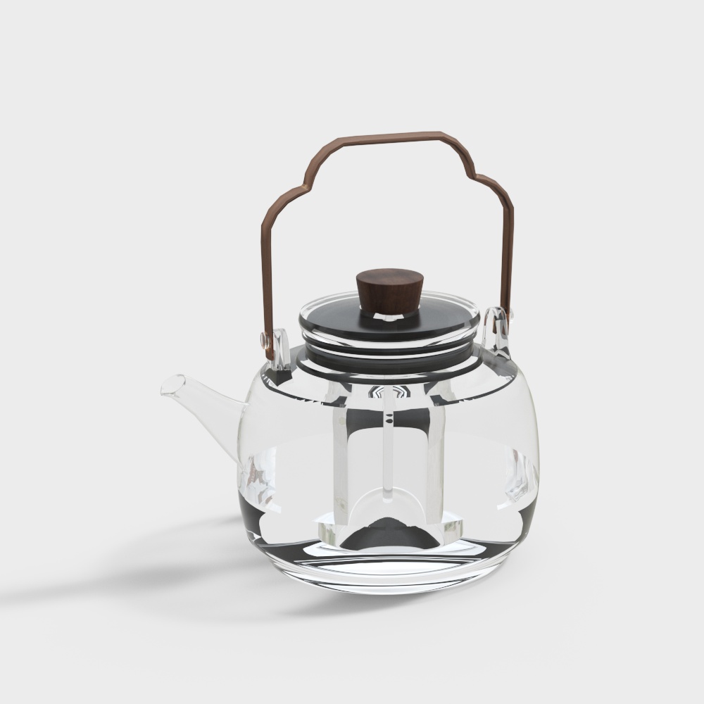 The Minimalist Polygonal Teapot 3D model showcases a transparent glass body, brown metal handle, and wooden lid. Built with low-poly geometry for efficient rendering, it suits interior design, game development, and VR scenes.