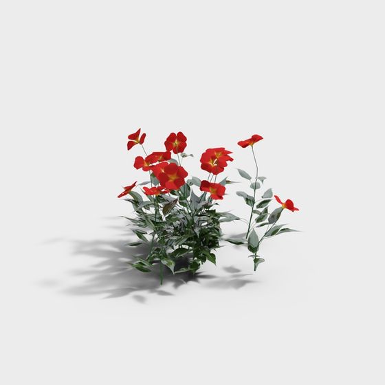 The Passionate Flower 3D model presents vibrant red petals and lush green leaves in a low poly design. Composed of 1,200 polygons, it is optimized for VR, animation, game development, and interior visualization.