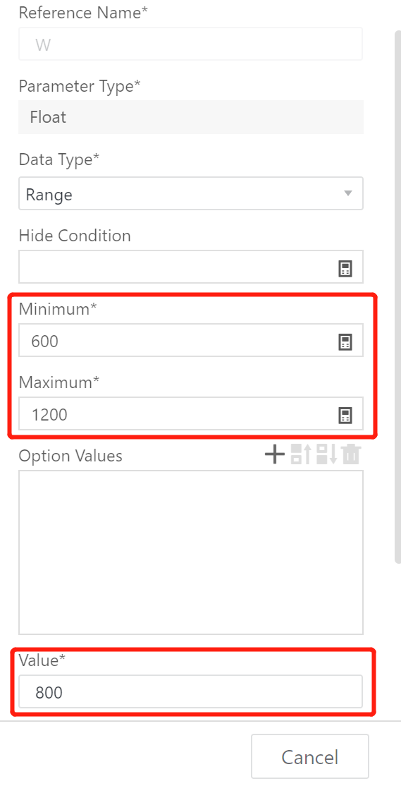 2.1. Width (W) - Represents the dimension along the X-axis, with value type set to a range (e.g., range 600-1200, current value 800).