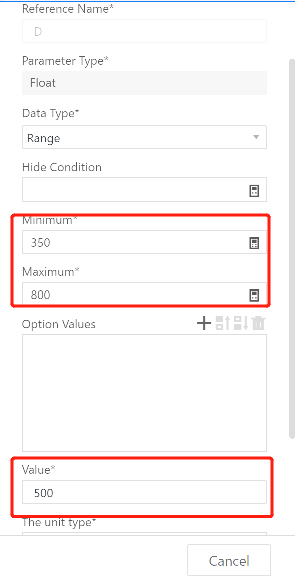 2.2. Depth (D) - Represents the dimension along the Y-axis, with value type set to a range (e.g., range 350-800, current value 500).
