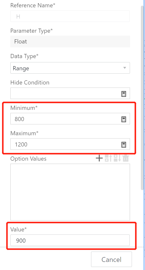 2.3. Height (H) - Represents the dimension along the Z-axis, with value type set to a range (e.g., range 800-1200, current value 900).